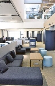 特筆すべきは「スキップフロア型構造」です。1階エントランスから3階ラウンジまで空間が連続し、部署の垣根を越えた交流が自然に生まれる動線計画が採用されています。この設計により、日常的な移動や休憩の中で偶発的な出会いが増え、研究者や技術者の間で新しいアイデアが生まれる土壌を形成します。