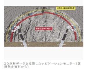 ナビゲーションモニターは、この新技術の中核を成す重要なインターフェースであり、オペレーターの「目」として機能する。360度カメラや3D点群データによって取得された、切羽掘削面、既設支保工、エレクターで移動する支保工の情報、そして目標設置位置といった膨大なデータを、オペレーターにリアルタイムで視覚的に提示する。この直感的かつ詳細な情報提供により、オペレーターは遠隔からでも正確かつ効率的に支保工の建て込み作業を進めることができ、熟練度に依存する作業品質のばらつきを抑え、常に高いレベルでの施工を可能にする。