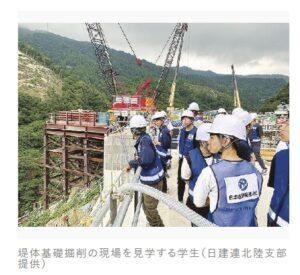 日本建設業連合会(日建連)北陸支部は2025年8月25日、石川県内の学生に土木の魅力を伝えることを主たる目的として、「現場見学会」および「若手技術者との交流会」を富山県南砺市利賀村にて開催しました。この行事には、金沢大学の土木系の学科で学ぶ大学院生12名が参加し、北陸地方整備局利賀ダム工事事務所の職員、さらには清水建設および大成建設に所属する若手技術者7名が同席しました。参加した大学院生は、北陸整備局が建設を進める利賀ダムの二つの主要現場、すなわち「利賀ダム本体建設第1期工事(清水建設・鴻池組JV)」と「利賀ダムの押場地区貯水池法面対策第1期工事(大成建設・東急建設・岩田地崎建設JV)」を視察しました。現場では、堤体基礎掘削や造成工といった建設の根幹をなす工程の様子が公開され、学生たちは土木の最前線を肌で感じることができました。また、昼食を囲んで行われた交流会では、大学院生、事務所職員、若手技術者の間で土木の仕事内容やそのやりがいをテーマに活発な意見交換が交わされ、学生にとって机上では得られない実践的な知識を獲得し、将来のキャリア形成を具体的に考察する上で極めて有益な機会となったと報告されています。