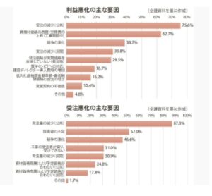特に地域別に見ると、東北地方では59.0%が受注状況の悪化を回答し、四国(52.7%)、中部(52.3%)と続いており、特定の地域でさらに深刻な状況が見て取れます。これは、地域に根差した建設会社が、発注量そのものの少なさから価格競争に巻き込まれ、経営基盤を揺るがされている現実を示しています。現場で働く皆さんにとっては、安定した仕事の確保が難しくなり、将来への不安を感じる原因にもなりかねません。
