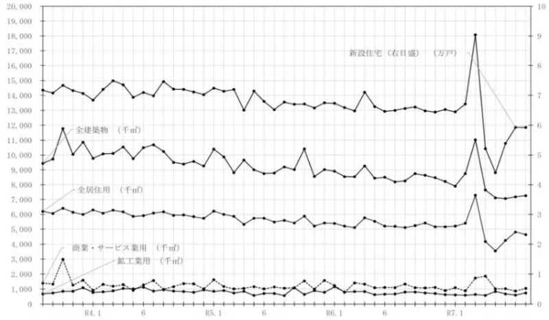 * 民間建築物:711 万平方メートル(前年同月比 ▲10.3%)で5か月連続減。
