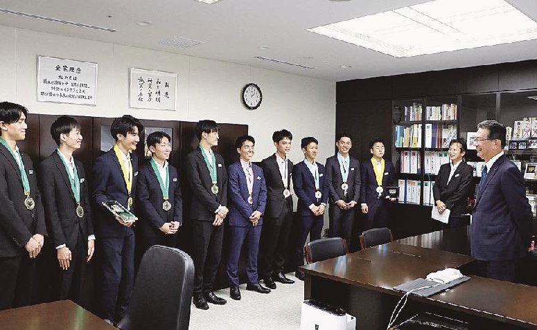 選手たちと喜びを分かち合う上板社長(右端)=きんでん提供
