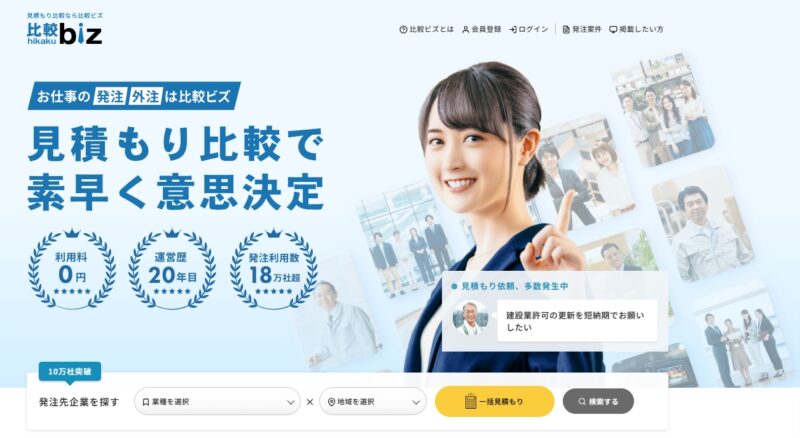 比較ビズは、業務委託、外注、専門サービスの比較を一括して行なえる国内最大級のビジネス比較プラットフォームである。建設業に限らず、経理代行、補助金申請支援、ホームページ制作、採用支援、物流、人材派遣など幅広いジャンルで、実際のサービス事業者や企業の情報を比較しながら検討できるのが大きな特徴である。利用者は無料で案件を投稿でき、希望する条件に合った企業から提案を受け取ることも可能である。その一方で、事業者側も新しい顧客や取引の機会を得られる仕組みを備えている。