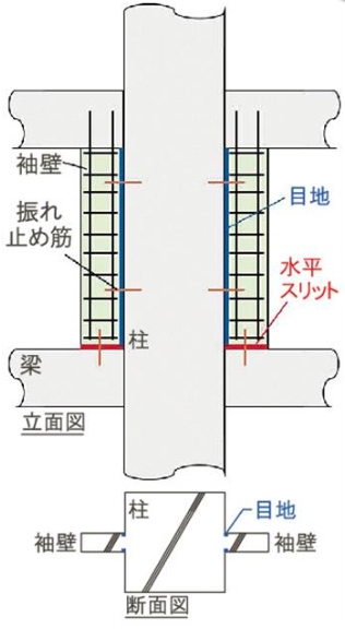 本技術は、袖壁内の鉄筋配置に工夫を凝らし、縦方向の鉄筋は梁に定着させる一方で、横方向の鉄筋は目地によって柱から切り離す構造を採用している。