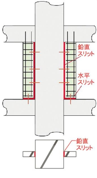 西松建設は、RC造(鉄筋コンクリート造)建物の袖壁付き柱において、鉛直スリットを一切使用しない革新的な「スマートスリット構法」を開発した。