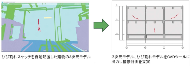 ひび割れを撮影した高解像度画像と、AIが生成したひび割れスケッチは、自動で3Dモデル上に配置されます。