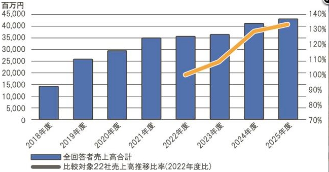 「比較対象22社」は、22-25年度全てに回答した会社の集計。22年度売上高を100%とした比率