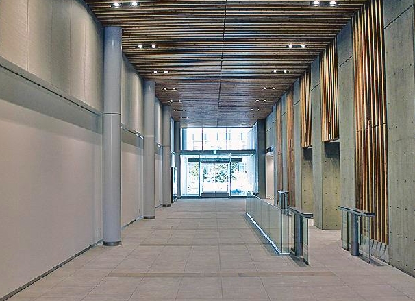 新庁舎では、北海道産カラマツや札幌軟石といった地域材を積極的に活用しています。エントランスコリドーのルーバーには道産カラマツの集成材、エレベーターホールには札幌軟石。来庁者が最初に目にする空間に「北海道らしさ」を表現しています。