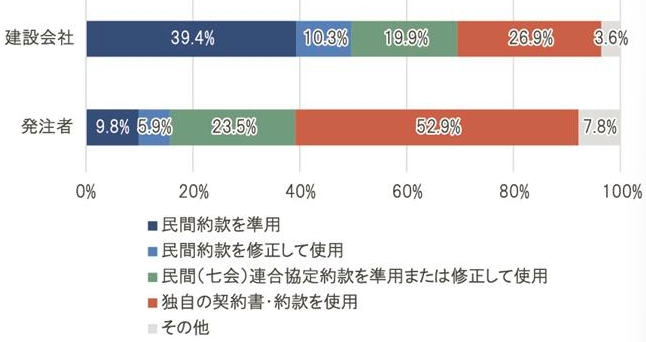 特に、民間発注者に限定した調査では、「独自の発注者約款・約款を使用」とする回答が52.7%と過半数を占めており、発注者の半数が独自様式を用いている現実がある。