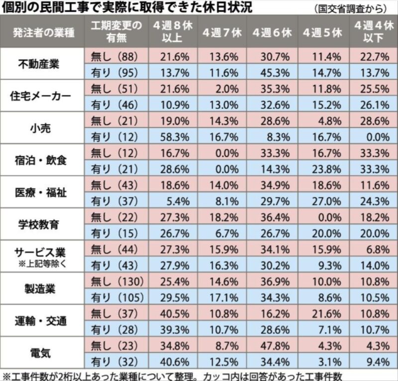 4週6休が最も多い状況は変わらず、工期変更があった場合でも、4週8休以上や4週7休以上の割合が伸びていることから、企業による現場管理の改善が感じられます。