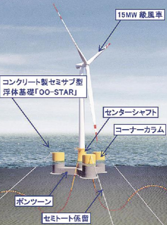 ※コンクリ製セミサブ型浮体式基礎「OO-STAR」概要図。画像は日刊建設工業新聞さまからお借りしました。
