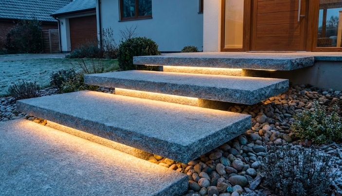 LEDバーライト(交換可能型):踏み面の裏側にアルミレールを設置し、そこに防水LEDテープライトを収めます。万が一の故障時も、レールから引き抜くだけで交換可能な施工方法を選びます。