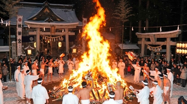 松焚祭の炎(御神火)には、正月飾りを焼いて神を送り出すとともに、一年の厄を払い、新たな息吹を得るという意味が込められている。
