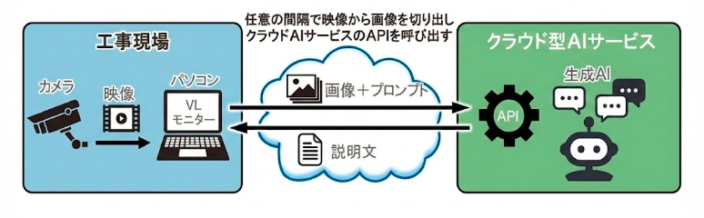 システムは、現場に設置したパソコンからカメラ映像を取り込み、市販のクラウド型AIサービスとAPIで連携して分析を行なう仕組みである。