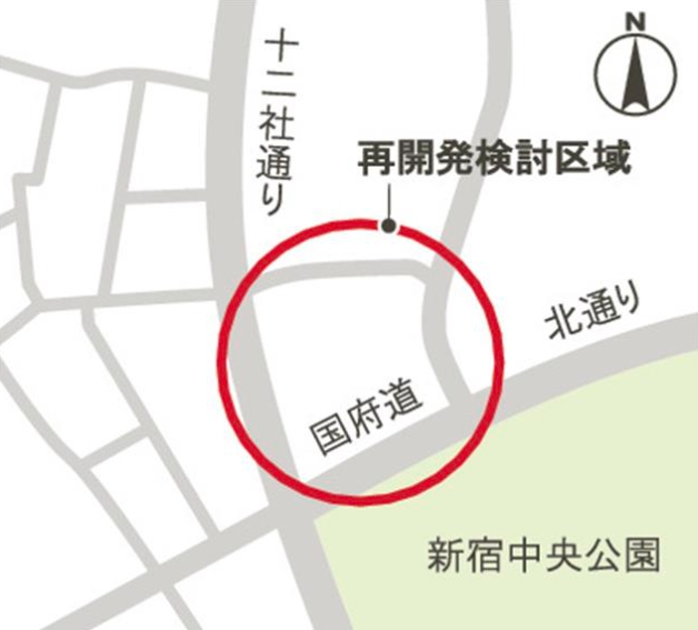 開発の舞台となる計画区域は、新宿中央公園に隣接し、十二社通りと国府道が交差する熊野神社前交差点付近の約0.7ヘクタールのエリアである。現在、区域内には「メインステージ西新宿」「タツミビル」「新都心ダイヤモンドマンション」といった複数の既存ビルが立地しており、今後の開発に向けて権利調整や解体の準備が進められる。