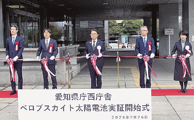 愛知県は2月26日、県西庁舎において次世代の再生可能エネルギーとして注目を集めるペロブスカイト太陽電池を設置し、発電効率などを検証する実証事業を開始した。同日、西庁舎の玄関前で開催された式典では、大村秀章知事や事業関係者らによるテープカットが実施された。