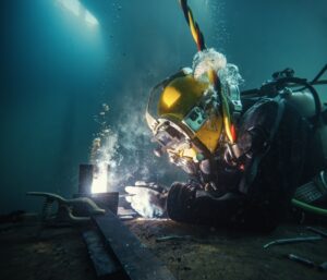 日本では、長大な海底トンネルや橋脚基礎の建設において、水中溶接が重要な役割を担います。潜水士はヘルメット型の特殊潜水装備を使い、強い水圧と視界不良の中で精密な溶接作業を行います。