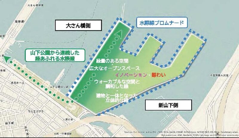 計画案によれば「緑と海辺に都市が包み込まれるような環境の創出」がコンセプトに掲げられています。大さん橋側のエリアには、広大なオープンスペースが配置される計画です。新山下側にはウオーカブルな空間と調和した緑、新たなシンボル施設が計画され、イノベーションを創出する機能が配置されます。
