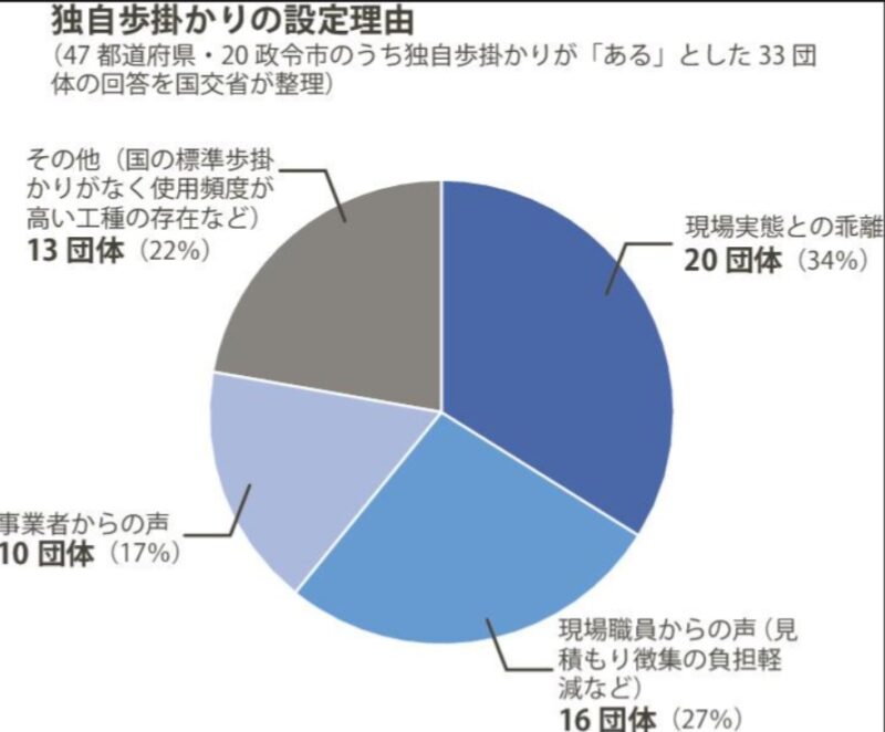 現場の実態に合わないのであれば、各自治体が独自に地域の実情に即した歩掛かりを設定すればよい、と考えるのが自然です。実際に、調査対象の都道府県・政令市の約半数にあたる33団体が、受注者からの要望や現場職員の声を受け、独自の歩掛かりを設けています。