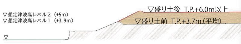 現況は標高3.7メートルですが、清水港付近の津波想定(レベル2)を踏まえ、6メートル以上にかさ上げ予定 🌊。防災力の向上と、将来的な土地活用も視野に入れた、行政主導の公共プロジェクトです🏗️。