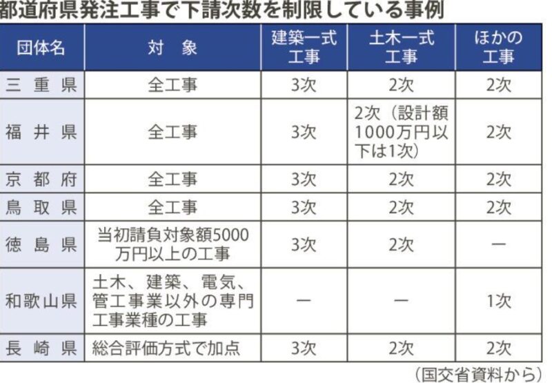 A:下請次数制限は過度な重層化を防ぐことを主眼としており、その具体的な制限範囲は、各都道府県や政令市が、受注者へのヒアリングや過去の工事実績を踏まえて設定されています。そのため、全国一律の基準ではなく、地域や工事種別によって異なります。