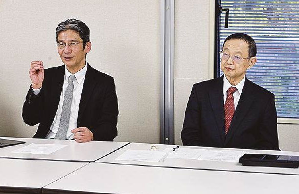 記者会見する池内会長(右)と小野田会長