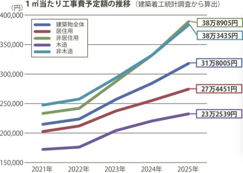 一方で、工事費予定額を床面積で割った工事単価は急激に上昇している。二〇二五年は前年比で一〇%を超える上昇となり、直近五年間では約一・五倍に達した。
