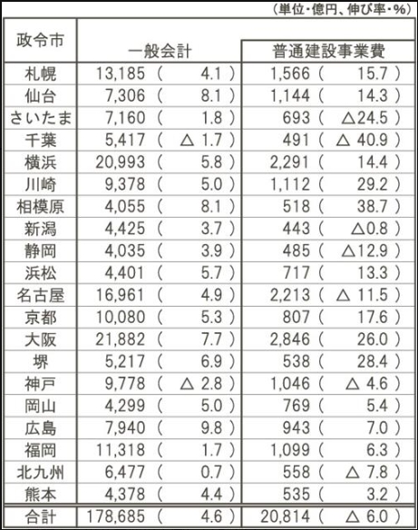 全国政令市の2026年度予算案が19日に出そろい、一般会計の総額は前年度比4.6%増の17兆8685億円となりました。一般会計は18市で増加し、うち14市が過去最大規模を更新する結果となっています。