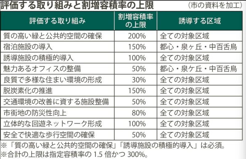 大阪府堺市は、都市開発誘導のため、都市機能誘導区域の容積率を緩和する新制度を4月1日より開始します。歩行空間や緑地整備など10の取り組みを評価し、内容に応じて容積率を割り増す仕組みです。上限は指定容積率の1.5倍かつ300%です。