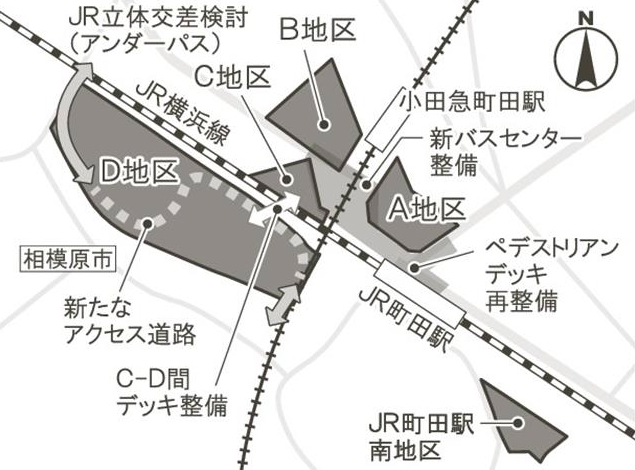 また、JR町田駅南地区では2027年度末までの都市計画決定を目標とし、JR東日本と共同で測量や基本計画作成を進めるため、予算案に「JR町田駅南地区まちづくり検討委託料」5520万円を計上しています。町田モディなどが位置するA地区では多摩都市モノレール延伸に合わせ、2030年ごろの都市計画決定、2040年ごろの完成を目指します。小田急側のB地区ではオフィスやシネコン、C地区ではライブホールなどの導入を想定し、それぞれ2030年までの都市計画決定を目指しています。