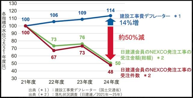 日建連の調査によると、2024年度は建設工事費が約14%増加しているにもかかわらず、NEXCO工事の受注総額・件数はなんと約50%も減少しています。さらに2025年度も減少傾向は続いており、政府関連企業からの受注額は前年同期比で27%減という厳しい状況です。