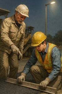 舗装の厚み・温度管理・出来形測定など、数値を意識させることで「新基準世代」として育てられます。