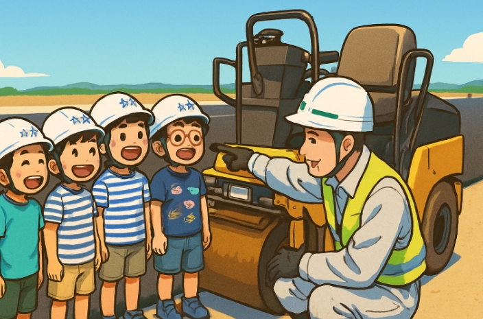 見学会では、現場担当者が子どもたちに説明を行い、作業を指導しています。これは、現場の技術者が、自身の専門知識だけでなく、**「教える」**という教育者としての役割も担っていることを示します。技術や工法はマニュアル化されても、重機の操作感覚や品質に対する厳格な姿勢といったノウハウは、人から人へと伝承される必要があります。