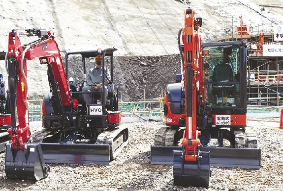 環境配慮型のバックホウ。電動式〈左〉とバイオ燃料型