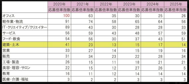 2020年時点では「軽作業・物流」が91を記録する中で「建築・土木」は41にとどまり、全12職種中6番手であった。2021年以降は状況が一変し、「建築・土木」の指数は2021年が23、2022年が13、2025年が14と低空飛行を続けている。職種別順位でも他業種に遅れをとり、現場レベルでの深刻な人材不足が浮き彫りになった。